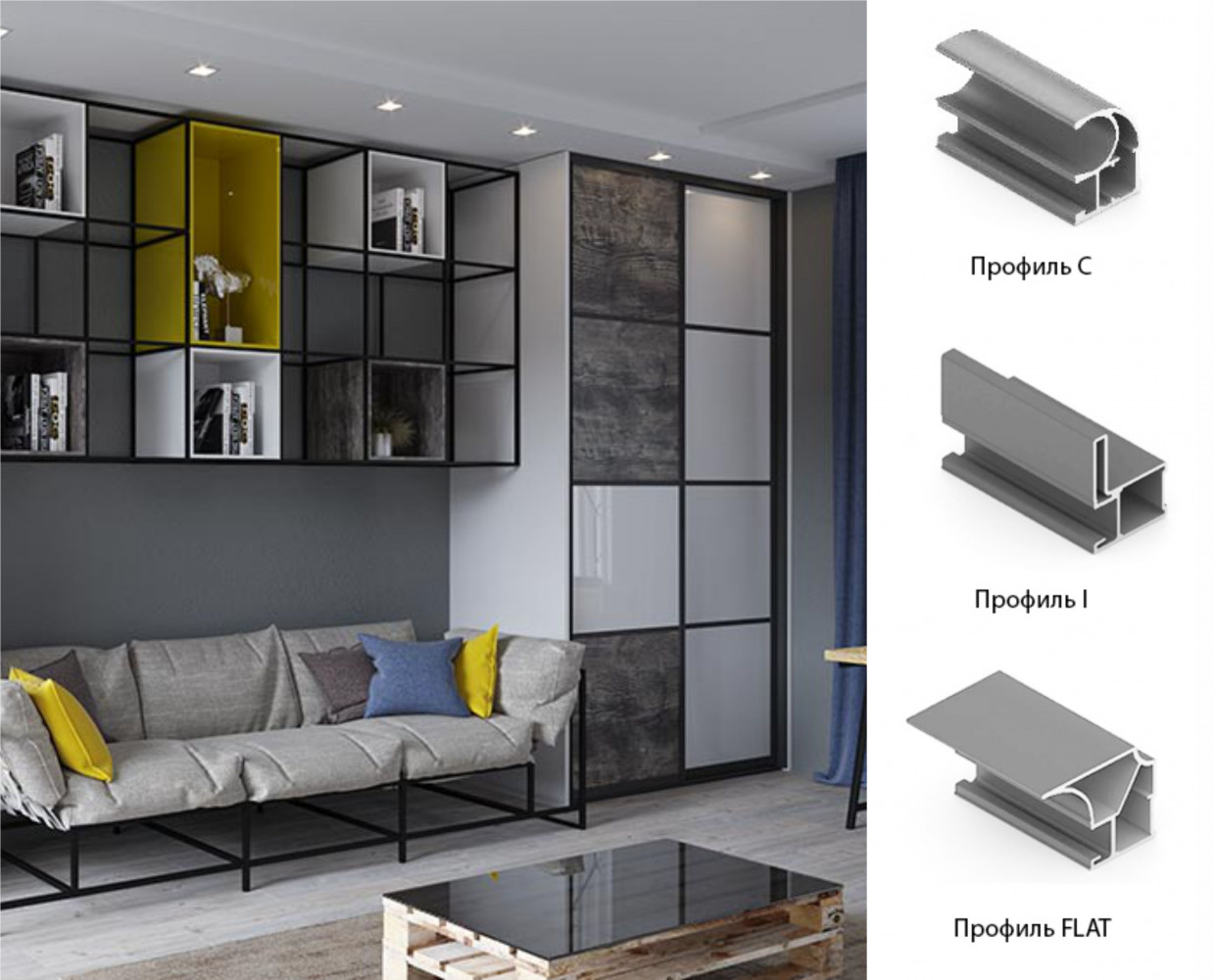 Система "Стандарт" — базовая линейка профиля, его конструкция позволяет выдерживать высокие нагрузки и изготавливать двери больших размеров. Широкий ассортимент профилей, комплектующих и цветов позволяет создать уникальные решения шкафов-купе. Базовый элемент системы - вертикальные профиля С (скругленный), I (квадратный), Flat (плоский).