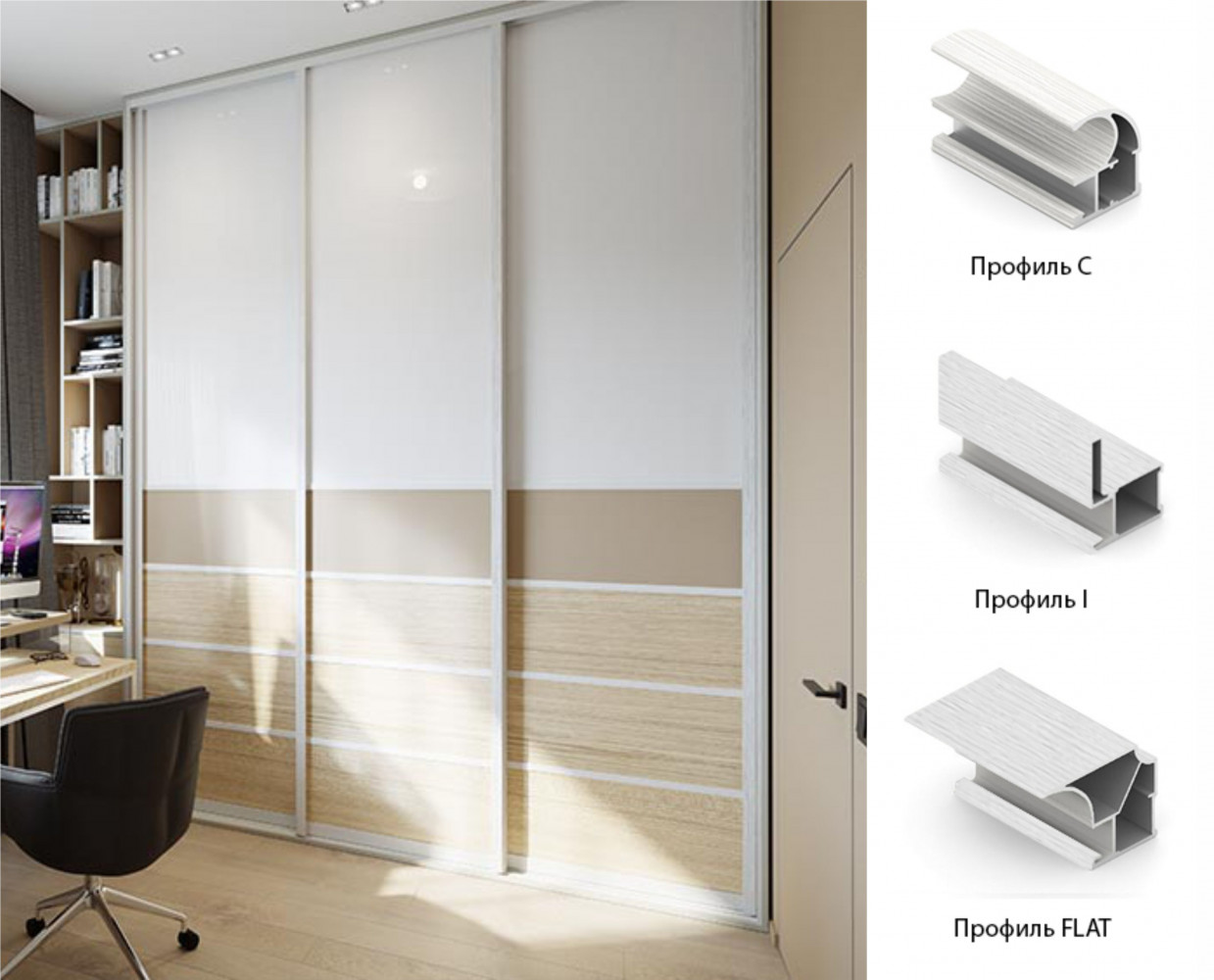 Система "Стандарт" — базовая линейка профиля, его конструкция позволяет выдерживать высокие нагрузки и изготавливать двери больших размеров. Широкий ассортимент профилей, комплектующих и цветов позволяет создать уникальные решения шкафов-купе. Базовый элемент системы - вертикальные профиля С (скругленный), I (квадратный), Flat (плоский).