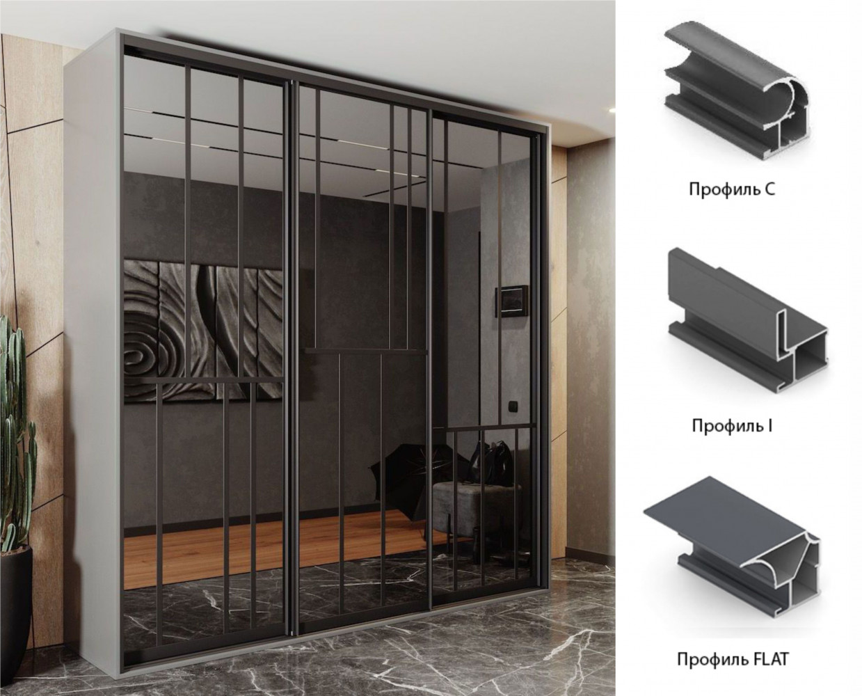 Система "Стандарт" — базовая линейка профиля, его конструкция позволяет выдерживать высокие нагрузки и изготавливать двери больших размеров. Широкий ассортимент профилей, комплектующих и цветов позволяет создать уникальные решения шкафов-купе. Базовый элемент системы - вертикальные профиля С (скругленный), I (квадратный), Flat (плоский).