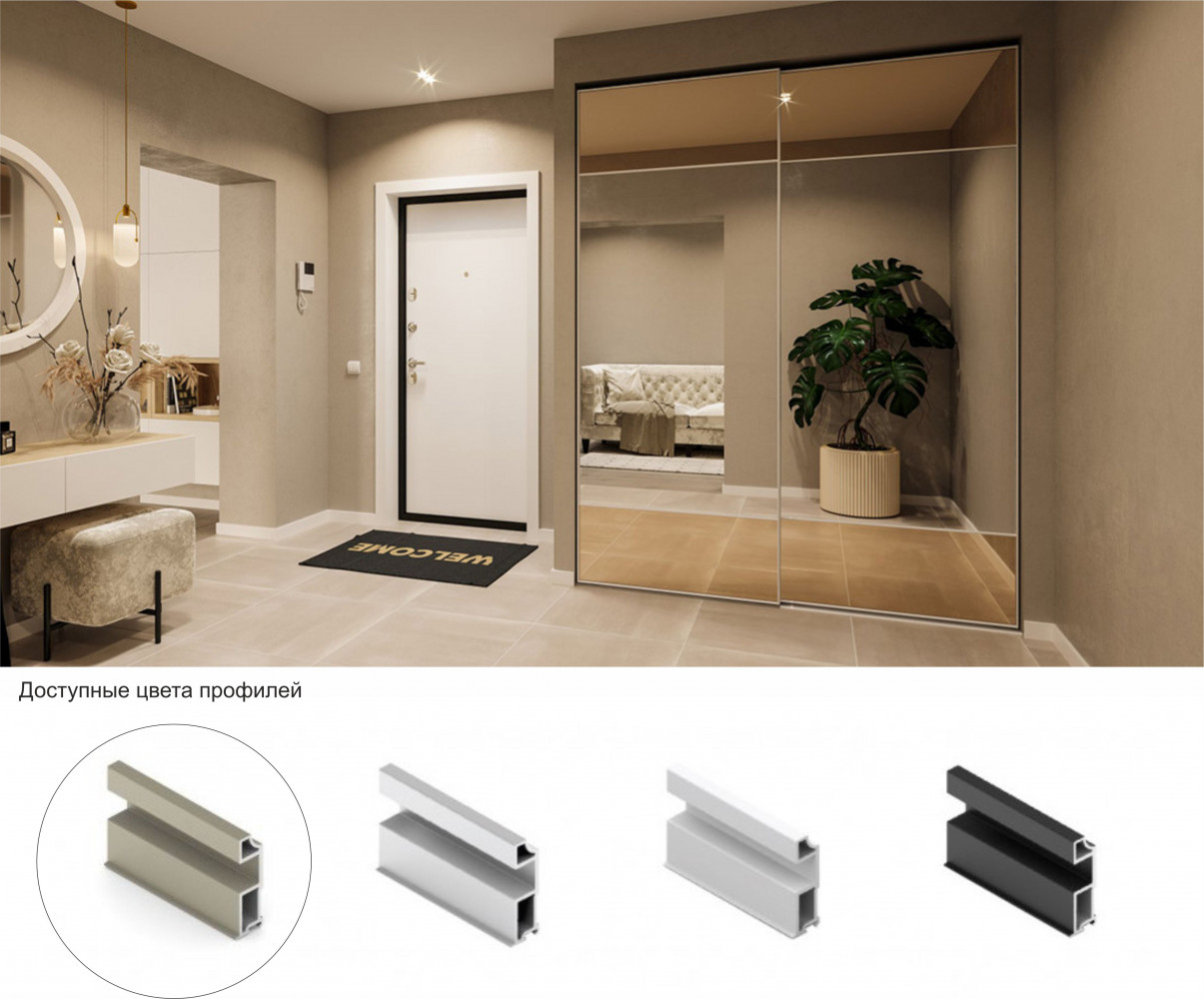 Комплект представляет собой зеркальные двери, которые подчеркнуты еле заметным профилем в цвете шампань.