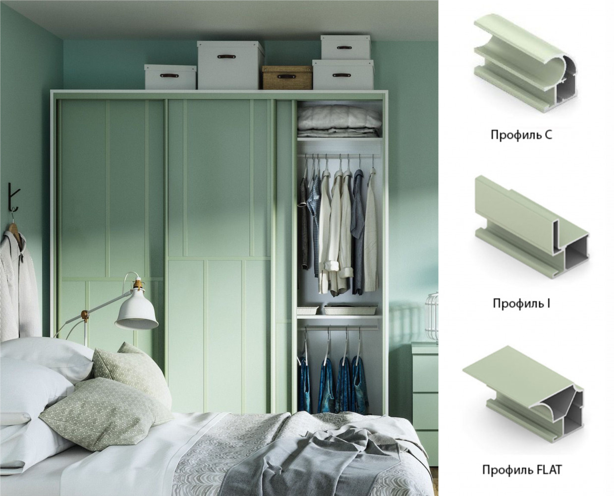 Система "Стандарт" — базовая линейка профиля, его конструкция позволяет выдерживать высокие нагрузки и изготавливать двери больших размеров. Широкий ассортимент профилей, комплектующих и цветов позволяет создать уникальные решения шкафов-купе. Базовый элемент системы - вертикальные профиля С (скругленный), I (квадратный), Flat (плоский).