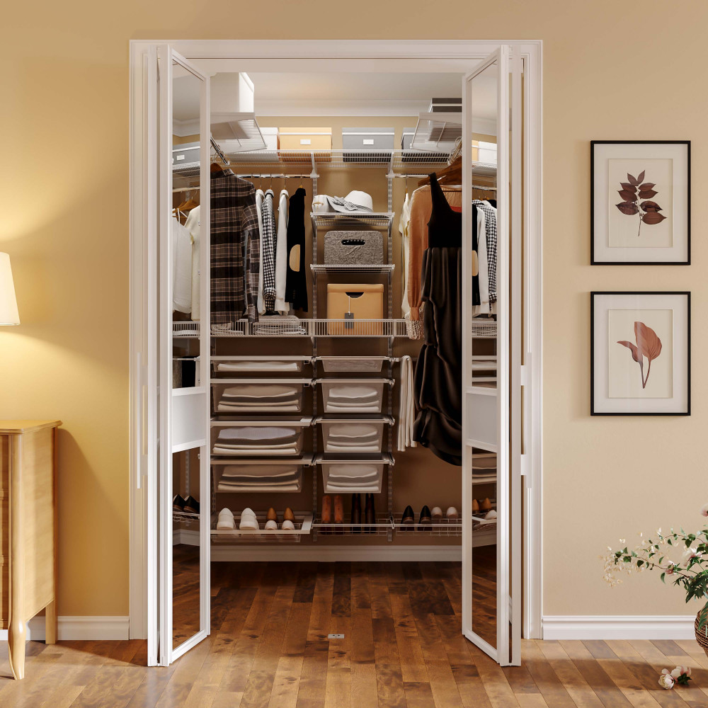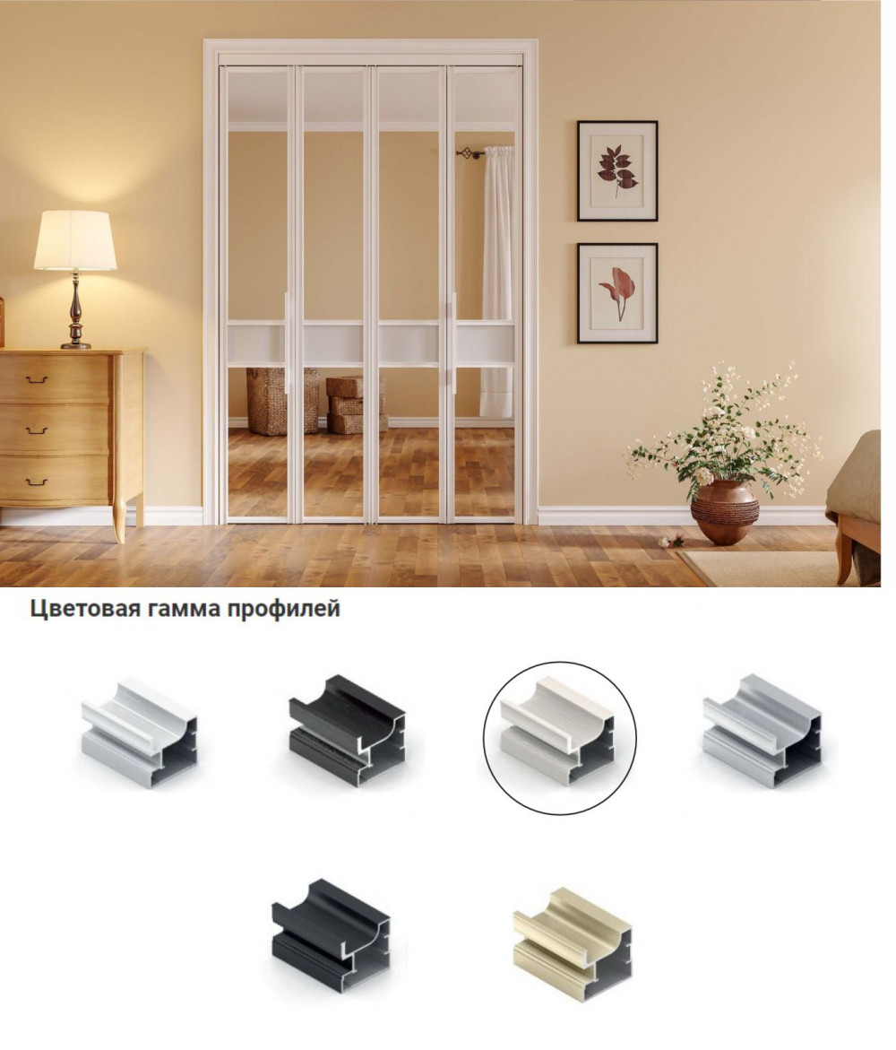 Складные двери шкафа занимают в два раза меньше места в открытом состоянии, чем обычные распашные двери. Это очень удобно, если помещение, в котором стоит шкаф не очень большое. Данный комплект дверей выполнен в нежных бежевых тонах, с использованием профиля в цвете дуб белый.