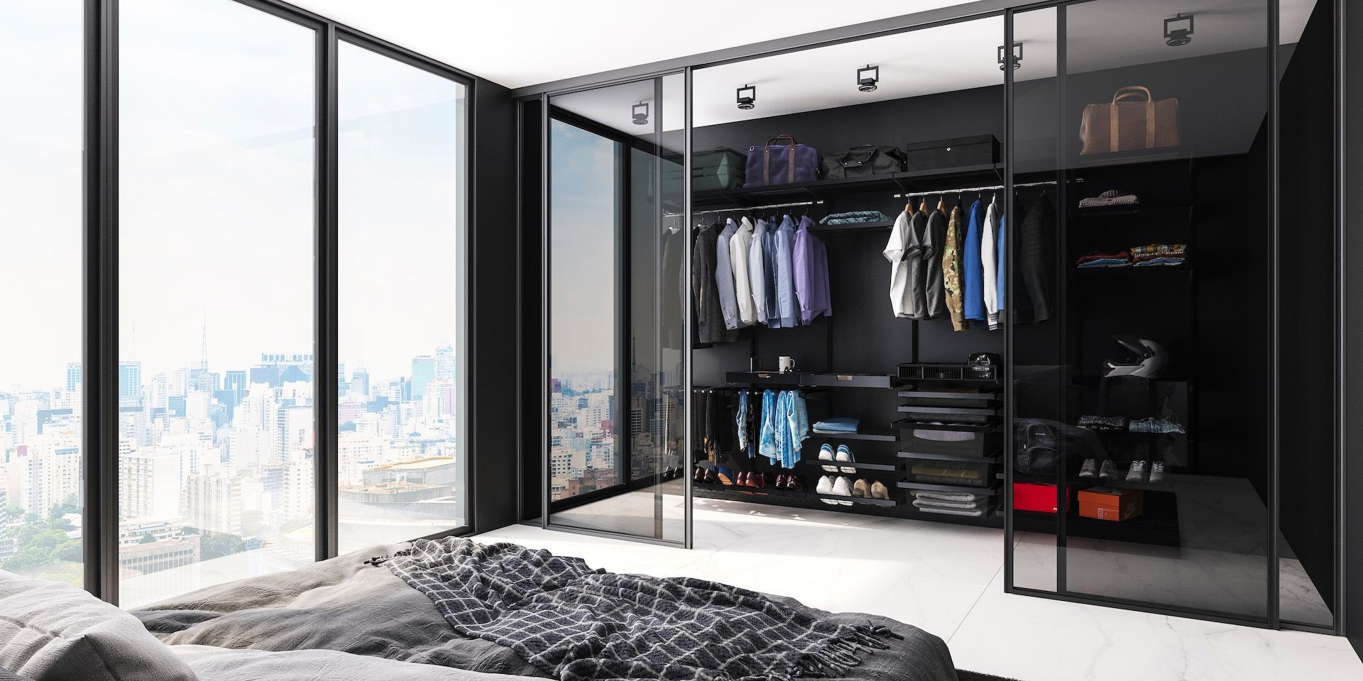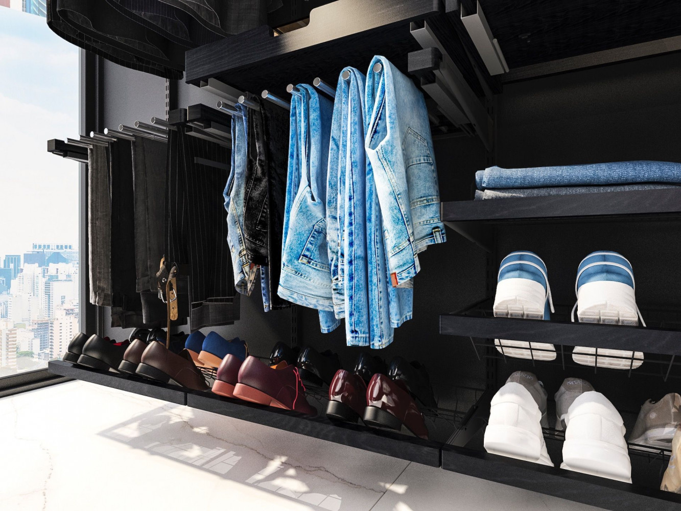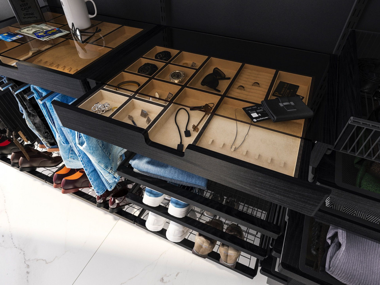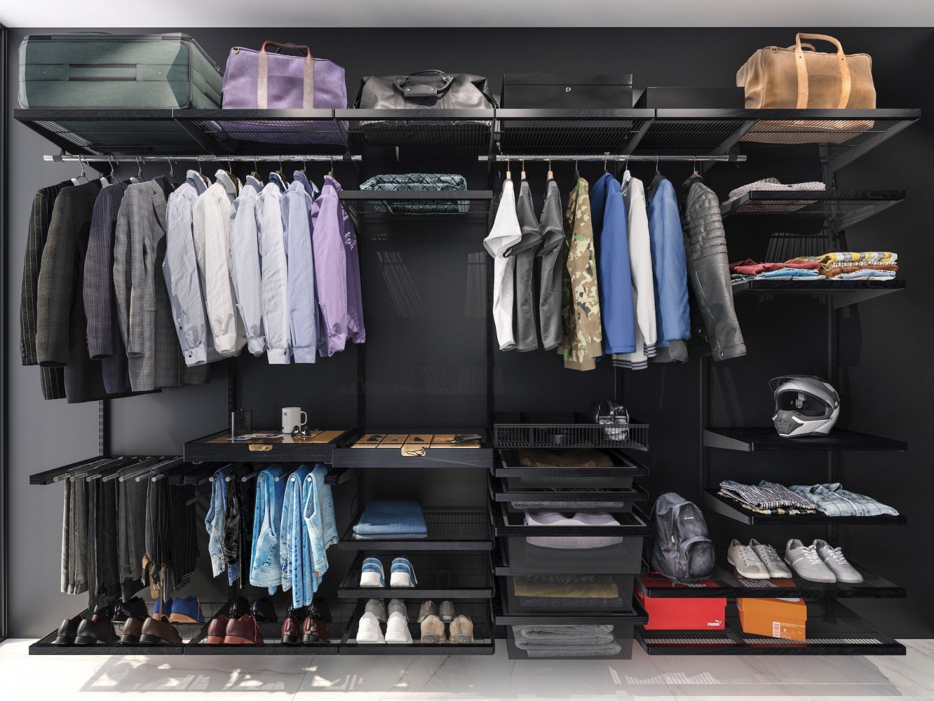 Мужчины не готовы тратить время понапрасну. Время — деньги. Они его ценят и экономят. Правильно организованная гардеробная — один из способов сбережения ценных минут. С гардеробной системой всё предельно просто: всё на виду, у каждой вещи своё место. Открытое хранение и упорядоченность позволяют сразу найти нужную одежду и быстро собраться. Секционное размещение гардеробной позволяет структурировать и зонировать хранение. А полезные аксессуары для хранения мелочей способствуют порядку: вешалка для галстуков, отсеки для ремней, корзина для носков, крючки для головных уборов, полочка для часов, очков, запонок.